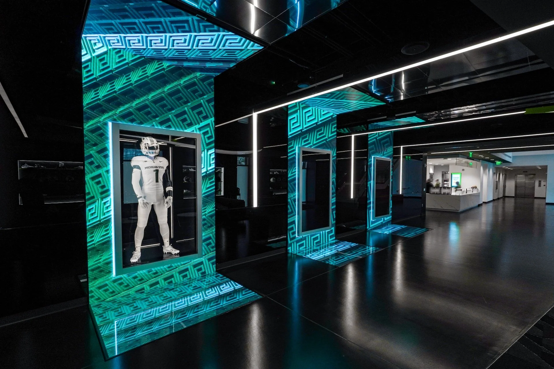 We had the opportunity to do some exciting work with Greenville's own Jack Porter. Under their design lead and concept direction, we were able to contribute animations to screens throughout the new Tom Izzo Football Building, including the giant 40’ x 20’ lobby wall and Nike Gear Lab. Below is just a sample of what we created.